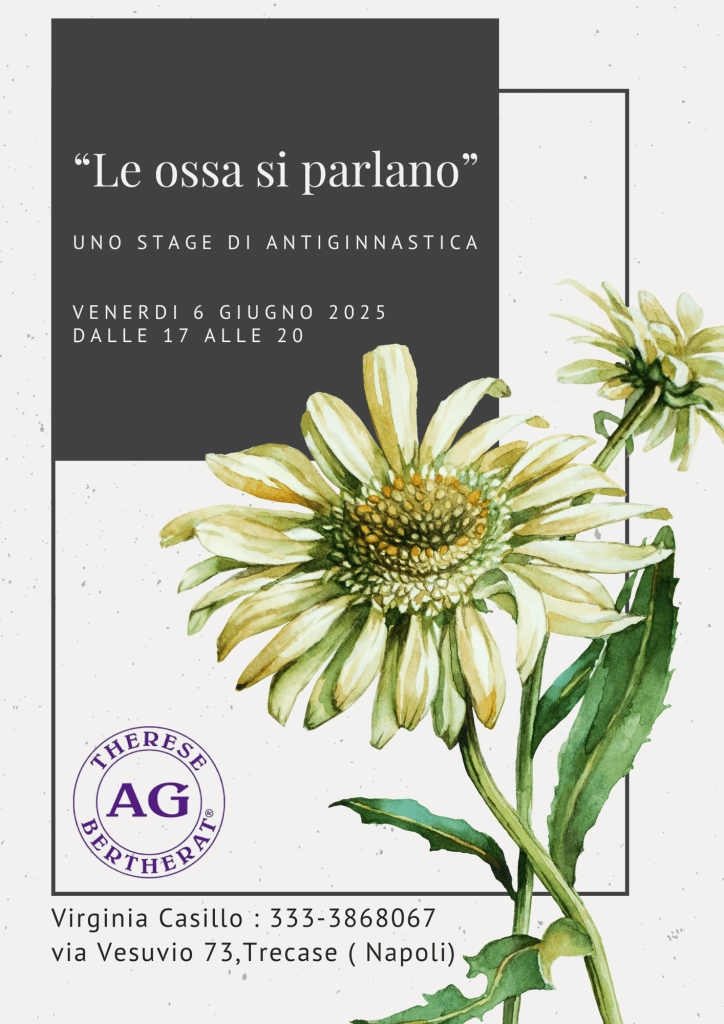 “LE OSSA SI PARLANO” e’ un lavoro di Antiginnastica di tre ore che si terrà nel mio studio di Trecase (Napoli). Il lavoro mira a riequilibrare i muscoli del davanti e del dietro del corpo, a favorire la percezione e l’ascolto di sé, a regolare il sistema nervoso attraverso movimenti precisi, lenti, efficaci che vanno in profondità, a liberare il respiro e favorire la circolazione energetica. Solo su prenotazione, vi aspetto con gioia!